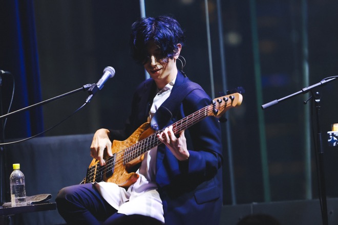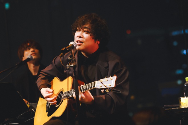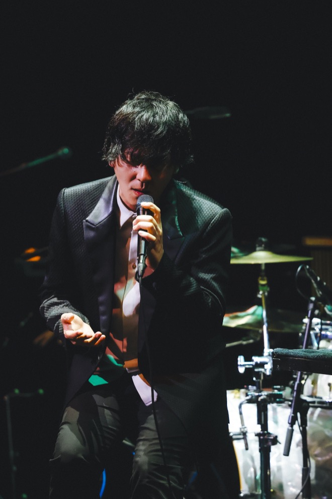 クリスマスシーズンを、「人を思うことの寂しさや孤独を教えてくれる季節」でもある、と表現した山村は、「そんな心の影にスポットライトを当てた曲」だと解説して「僕の存在」を届けた。ピアノとヴァイオリンによる序盤のアレンジは原曲に忠実で、山村の歌唱表現がより豊かに進化したことがハッキリと感じ取れる。やがて全員の音が加わり、しっとりとした演奏を繰り広げていく中、阪井のギターソロは圧巻。多彩な音色を次々と繰り出し、情感豊かなメロディーを爪弾いた。メンバーは背後から強いライトに照らされ、逆光の中で曲を終えるとそのまま小倉のドラムから「ディスカス」がスタート。尼川のベースがファンキーに跳ねながらリズミカルに絡んでいく。艶っぽさと遊び心のあるアレンジで、山村は立ち上がりステージを動き回ってパフォーマンスした。