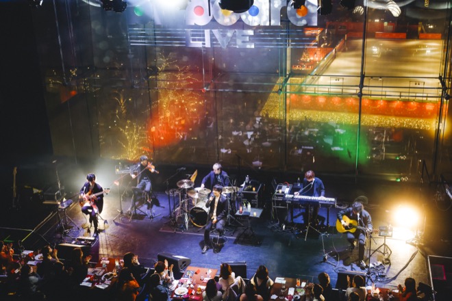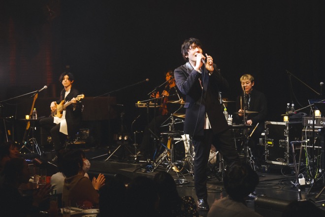 クリスマスソングのBGMが流れる場内では、開演を待ちながら食事やドリンクを楽しむ観客。厳かな鐘の音が響くと、メンバーは階段を降り、客席エリアを通過してステージに到着。阪井一生(G)、尼川元気(B)、小倉誠司(Dr)、最後に辿り着いた山村隆太(Vo)は大きく両手を広げて礼をして、ハンドマイクを握り「君が笑えば ~Just like happiness~」を歌い始めた。思いがけないレア曲の披露だったが、温かなコーラスが生み出すハーモニーは、ライブのコンセプトにピッタリと合致している。観客は着座のままステージを見つめ、メンバーも基本的にはチェアに腰掛けて歌唱、演奏し、落ち着いたムードでライブは進んで行った。