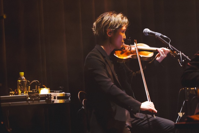 阪井の歯切れのよいギターと尼川のベースで始まり、艶やかなヴァイオリンの音色が加わってスタートした「DILEMMA」は、原曲とガラリと印象の変わった大人びたアレンジで驚かせた。《抱き寄せる》というフレーズを歌いながら、伸ばした右手をグッと引き寄せるなど、山村は身体の動きも駆使して表現豊かに歌唱。小倉のドラムは華やかなフィルインを鳴らし、杉本のピアノも眩く煌めいた音色を奏でた。「two of us」はピアノで始まり、小倉のドラムはジャジーな匂いを漂わせ、雰囲気を一変させていた。