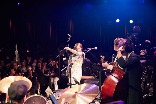 ライブ中、彼らの名前を何度聞いただろう。最初のメンバー紹介を挟んで演奏された「Loving You」、「Why」は、この顔ぶれだからこそのサウンドを堪能するパートでもあって。黑いアコースティックギターを抱えた宮﨑薫も加わり、6人で奏でるアンサンブルは実に多彩。その流れで(しかも千田はヴッドベースに持ち替え、タルタの手にはスレイベル!) クリスマスソング・セクションに突入すれば、当然、スウィートもハッピーもドラマチックも加速度を増していくわけで。「Feel Like Itʼs Christmas」で観客も声を合わせ、一緒に体を揺らしたら、「愛する人」では美しくも力強い丸の内イチのシンガロング! 前半はピアノと歌声だけで、後半はふくよかなバンドサウンドで届けられた「Very Merry Christmas」は、びっくりするくらいキュートだったな。さらにクリスマスのスタンダードナンバーをメドレーでプレゼント。中でもヴォーカルもプレイもメロウにアレンジされた「Last Christmas」は、本来この曲が内包する切なさをそのままの温度と湿度で手渡された感じがした。