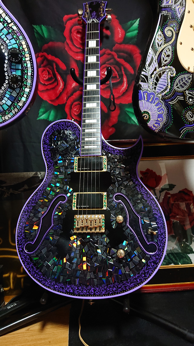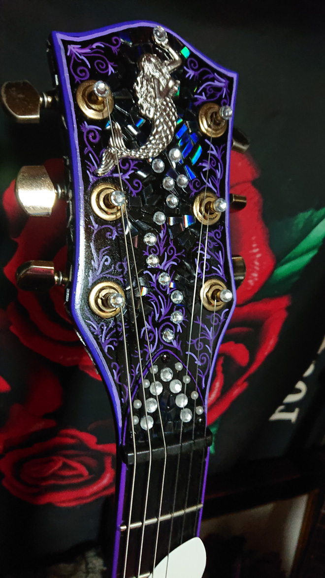 いやいや、すげえなおい。手つかずの状態から途中経過の写真もあるので、その工程がよく分かるのですが、fホール周りの点描もバインディングに沿ったペイズリー柄も全て自身による手書きなんですよね。才能だなあ。ここまで来ると誰々っぽいというものではなく、完全にEBIサンのオリジナリティを感じます。ゼマイティスのパールフロントだって、こういう妖艶さはないもん。バインディングがラベンダーな色に塗られているのも、この雰囲気に一役買っているみたいですね。マネスキンが持ったら似合いそう。(JMN統括編集長 烏丸)