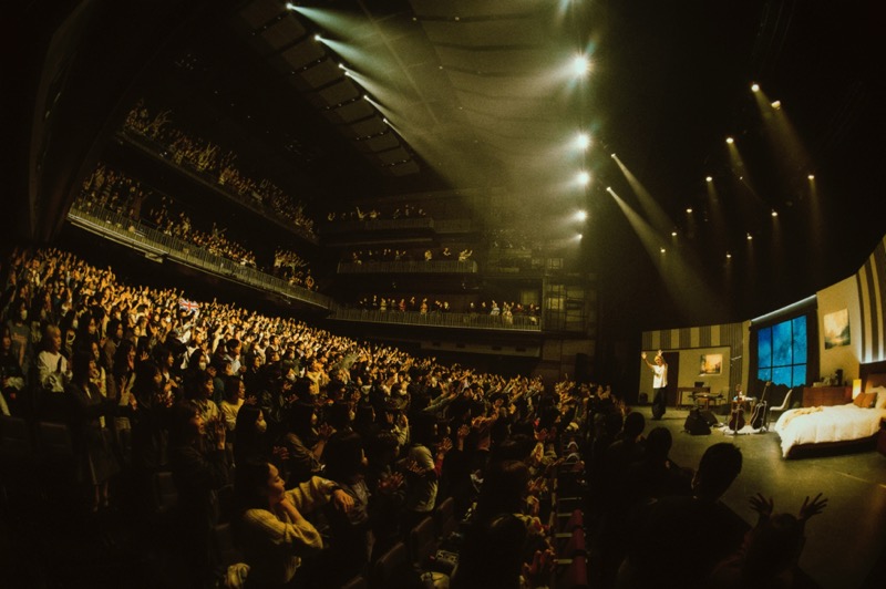場所は2023年にオープンしたばかりの新宿の新名所・東急歌舞伎町タワーの6階にあるTHEATER MILANO-Za。ステージ上にはベッドやテーブル等が置かれ、ライブタイトルに<room>と冠しているように、まるで部屋のような空間が広がっている。そんな空間にふらっと現れた川上洋平は拍手と歓声が上がる中、「いいね、ホテルだね」と呟いてから、ステージ中央の椅子に座った。アコースティックギターを手にし、「今日はリラックスしてやりますので」と言って、大きく一息ついて、「spy」を奏でた。