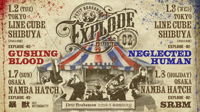 ──新曲「a humble border」が初めて生で聴けるのが、東阪全4公演がそれぞれ異なるコンセプトにて開催されるライヴシリーズ<EXPLODE-02->になりそうですね。1月2日は<EXPLODE -02- Gushing Blood>、1月3日は<EXPLODE -02- Neglected Human>と題して東京・LINE CUBE SHIBUYA(渋谷公会堂)にて開催。1月7日はゲストにROTTENGRAFFTYを迎えて<EXPLODE -02- 暴獣>、1月8日は<EXPLODE -02- SRBM>と題して大阪・なんばHatchで開催されます。この東京公演2daysでは、それぞれ2曲入りの来場者限定CDも配布されるそうですね。