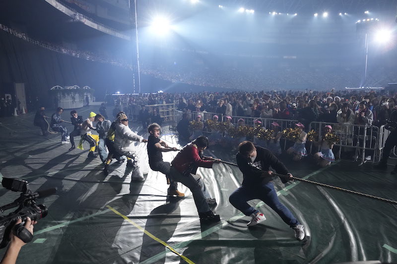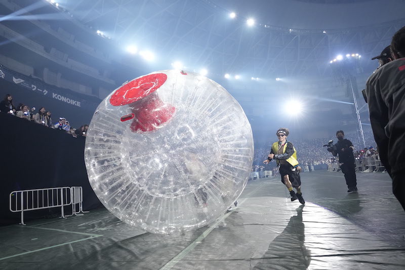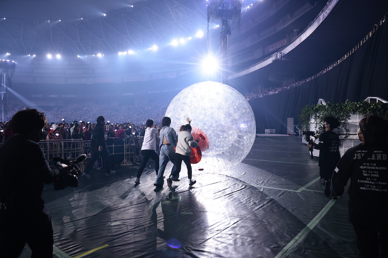山下から小林へ進行役をチェンジし、続いては事前に選ばれたMATEとメンバーによる「大玉リレー」へ。MATEとメンバーはそれぞれ2チームに分かれ、どちらが早く大玉をゴールまで転がせるかを競った。対決前はELLY、山下、岩田チームの勝利を予想する声が多かったが、結果は今市、ØMI、NAOTOチームの勝利。対決後にメンバーは「なんか感動した」「大玉転がしってこんなに辛いんだね」「ドームを贅沢な使い方してるね」と口々に感想を述べており、その表情からは楽しそうな様子が伝わってきた。