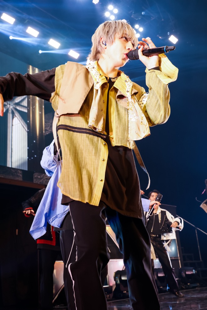 続いては、メンバーから連想される楽曲を披露するコーナーに。公演ごとにピックアップされるメンバーが替わり、東京公演では『吉澤要人といえばこの曲』と『杢代和人といえばこの曲』のお題が選ばれた。2人とも「みんなを惚れさせたいと思います」と競い合っては、結局「2人で惚れさせよう」と、なぜか杢代が吉澤の頬にキス。最終的に前者では吉澤がリードボーカルを担うチルポップ「蝋燭」、後者では杢代の演技が黄色い悲鳴を呼ぶ「半分相逢傘」が披露された。「蝋燭」は吉澤の低音の上に小泉や長野らの歌声が代わる代わる乗っていく、まさしく吉澤がいなければ成り立たない楽曲で、カメラに微笑みながら届ける艶めかしい声音に、誰もが骨抜きになってしまう。“いつも低音で曲を支えている要人くんがメインで歌っていて、綺麗な低音の歌声をじっくり楽しめます。ゆったりした曲調も要人くんにぴったりです”という観測者からの意見も納得だ。加えて、この曲も振り付けがパフォーマンスされるのは今回が初。ひっそりと揺らめく蝋燭のように、抑えたエモーションの中に漂うユルさと緊張感のせめぎ合いが心地よい。