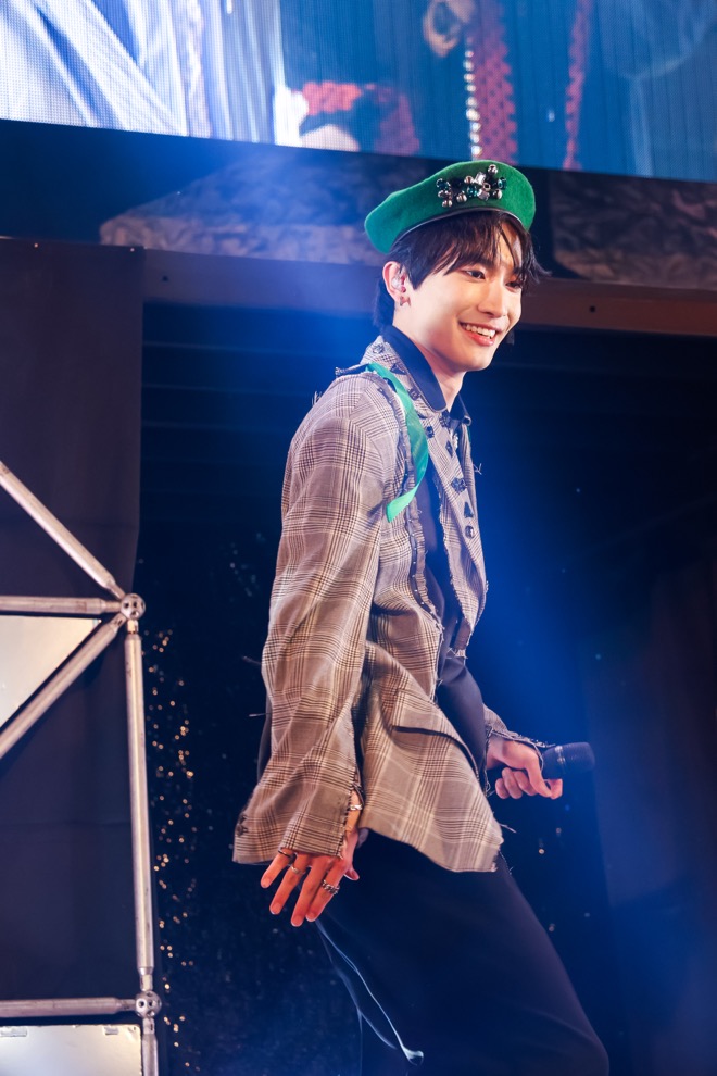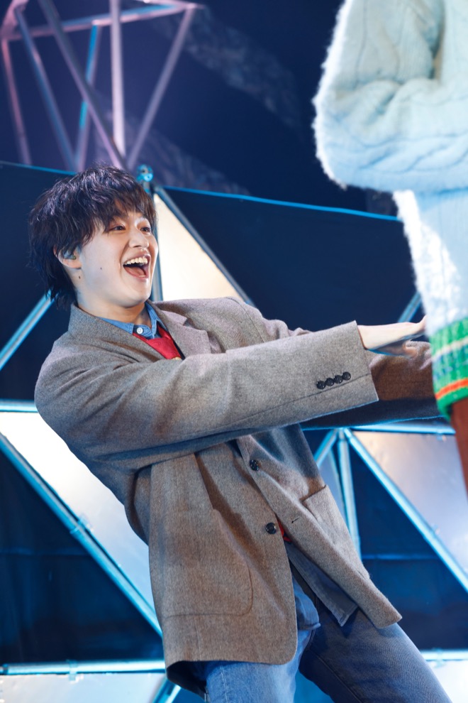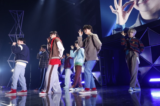 オープニングSEも映像もなく、ギターとピアノの音が鳴るなり突然「1、2、3、4!」とステージの上段に7人が登場して、「放課後ギュッと」でライブが幕開けると、観測者で満杯のスタンディングフロアは大騒ぎに。リリース時に『仮面ライダーギーツ』の撮影でグループ活動を制限中だったため、この曲をステージでパフォーマンスするのは初めてになる杢代和人が「2023年、僕たちと一緒に締めくくる準備できてますか?」と呼びかければ、客席のペンライトも一斉に振りあがる。学校生活をモチーフに、若さあふれるポップで可愛い「放課後ギュッと」を1曲目に持ってくるのも、いつもよりオーディエンスとの心の距離が近いファンミーティングならでは。ライブ冒頭から場内の温度はダダ上がりだ。さらに、おなじみのダンスポップ「ギミギミラブ」へとなだれ込めば、観測者の “炭酸水!”の声が飛び、小泉光咲が「皆さん一緒にクラップお願いします!」と告げるまでもなくクラップの嵐に。そんな観測者の熱さにあてられてか、ステージ上のメンバー同士も普段より距離が近い。