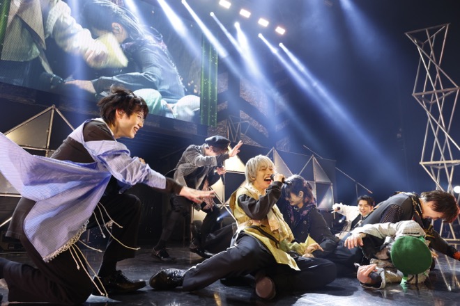 続いてのお題は『”陰”だと思う曲の中で一番好きな曲は?』と『”陽”だと思う曲の中で一番好きな曲は?』という正反対の2問。前者に対しては “湿度が高そう”“大人っぽい”“音の創り全てに陰を感じます”といったコメントが、後者には“全員が大好きで大盛り上がり出来る”“可愛い笑顔で踊ってるのが好き”“普段イヤホンで聞いていても声を出しそうになる”といった感想が表示された。結果、披露された“陰”の曲は「豪雨」。床を揺らすように響く低音から、テンションを深く沈みこませて“帰れないよ”と歌い上げ、狂おしくステージに立ち込めるスモークは肌を刺すほど冷たく映る。そこからは小泉のファルセットで、一気に“陽”の曲「GOD 釈迦にHip-Hop」へと急転。「みなさん、楽しんでいきましょう!」と桜木雅哉が号令をかけて、ゲンジブの“隠れ自己紹介曲”で明るく跳ねる彼らに、客席からは大きな掛け声が飛ぶ。曲中「今年もありがとう!」と笑顔を見せた杢代は武藤潤や吉澤要人と一緒にステージ上でぐるぐる追いかけっこをして、最後は観測者と“き・き・きすみー!”と大合唱。あえて陰と陽に振り切ることで、げんじぶのふり幅を示し、ポテンシャルの大きさを証明してくれた。