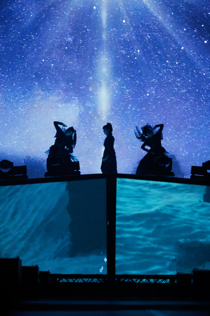さらに続けてこの日が初披露となる新曲「Sunset Kiss (feat. Polyphia)」が始まると、再びメインステージが浮き上がり、BABYMETALのメンバーは巨大LEDスクリーンに映し出された幾何学的な空間に吸い込まれる。先ほどの曲とはガラリと変わった風景が広がり、新作アルバム「METAL FORTH」収録曲のバライティーに富んだ幅広さを物語っているようだ。
