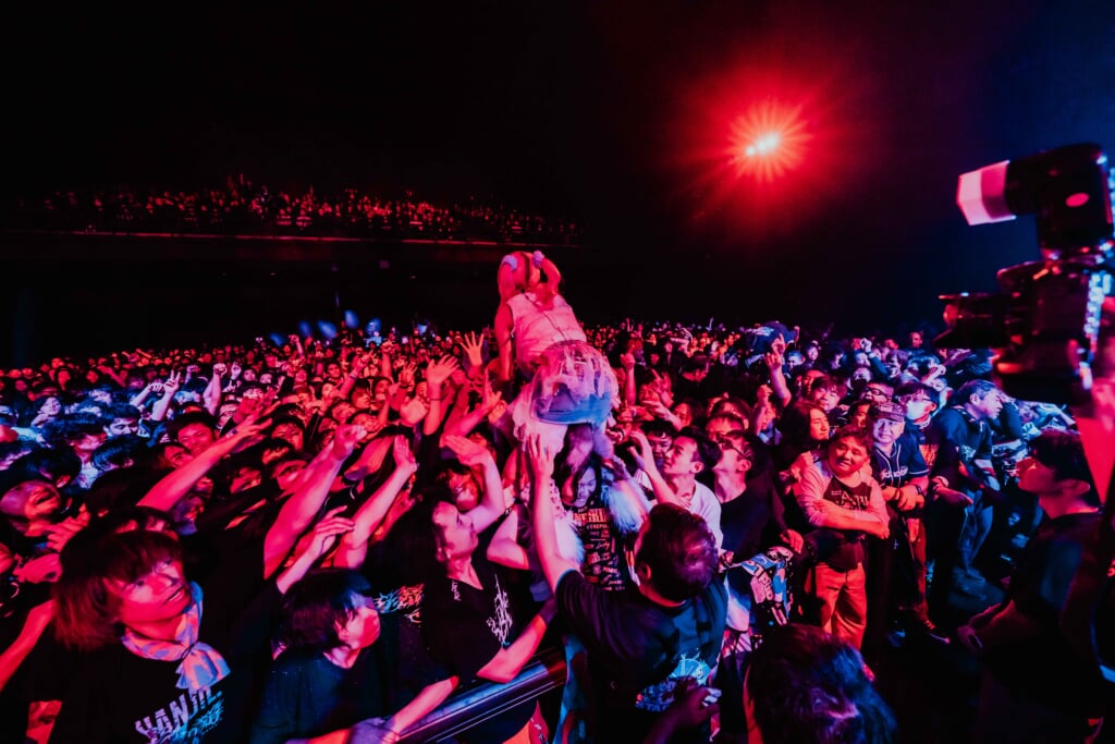 4番手はFear, and Loathing in Las Vegas。昨年は自身の対バンツアーに花冷え。を招いたラウドロック界の雄が、今度は花冷え。に招かれ<春の大解放祭2025>に登場した。1曲目の「Return to Zero」から、混沌と調和を自在に操りながら爆発的な盛り上がりを見せるパフォーマンス。狂騒的なビートとメロディで観客たちを翻弄し、興奮の渦に巻き込みつつ、パラパラや「Virtue and Vice」でのタケノコダンスなどユーモラスな振り付けで一体感を生み出すその姿は流石に百戦錬磨のライブバンド。観客たちの中でもみくちゃになりながら咆哮を上げるMinami(Vo, Key)の姿も、グッチャグチャなのに美しかった。今年は9月に阪神淡路大震災から30年の節目として、主催フェス「POWER OF KOBE」の開催も発表しているFear, and Loathing in Las Vegas。背負うものを大きくしていく今の彼らの逞しさと、不変の鮮度で人々を巻き込み続けるそのユーフォリアとカオスを堪能した。