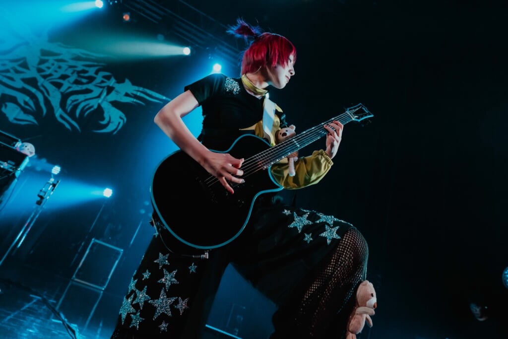 続いては、日本のハイパーポップ代表格といえるアーティスト4s4ki(アサキ)。DJとふたり編成での出演となった彼女は、この日唯一のバンド以外のセットでの出演となったが、その極彩色でカオティックな存在感は花冷え。とも深い場所でのリンクを感じさせるし、何より、そのマッシヴなビートと感情の洪水のようなメロディがもたらす感動はまさに「大解放」と呼ぶに相応しい。エナジェティックなハイパーポップサウンドだけでなく、「風俗嬢のiPhone拾った」ではピアノと歌だけの弾き語りで会場を深い沈黙に誘うなど、表現力の豊かさも圧巻だった。MCで繰り返し語った「死ぬ気でやってるから、死ぬ気でかかってきてほしい」という言葉も印象的だったが、その言葉の後にはじまるのはいつも優しい曲たちで、この優しさや繊細さこそ、4s4kiが死ぬ気で守りたいものなのかもしれない。