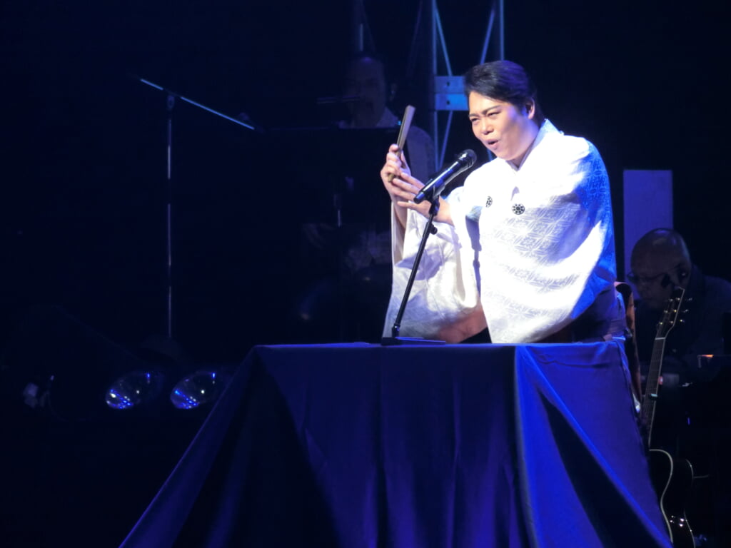 その後、三山が創り出した新ジャンル、落語と歌を掛け合わせた『落語歌謡』の第二弾、「お菊の皿」を披露、途中、衣装の着物に仕込まれたLEDが光り、観客を驚かせた。