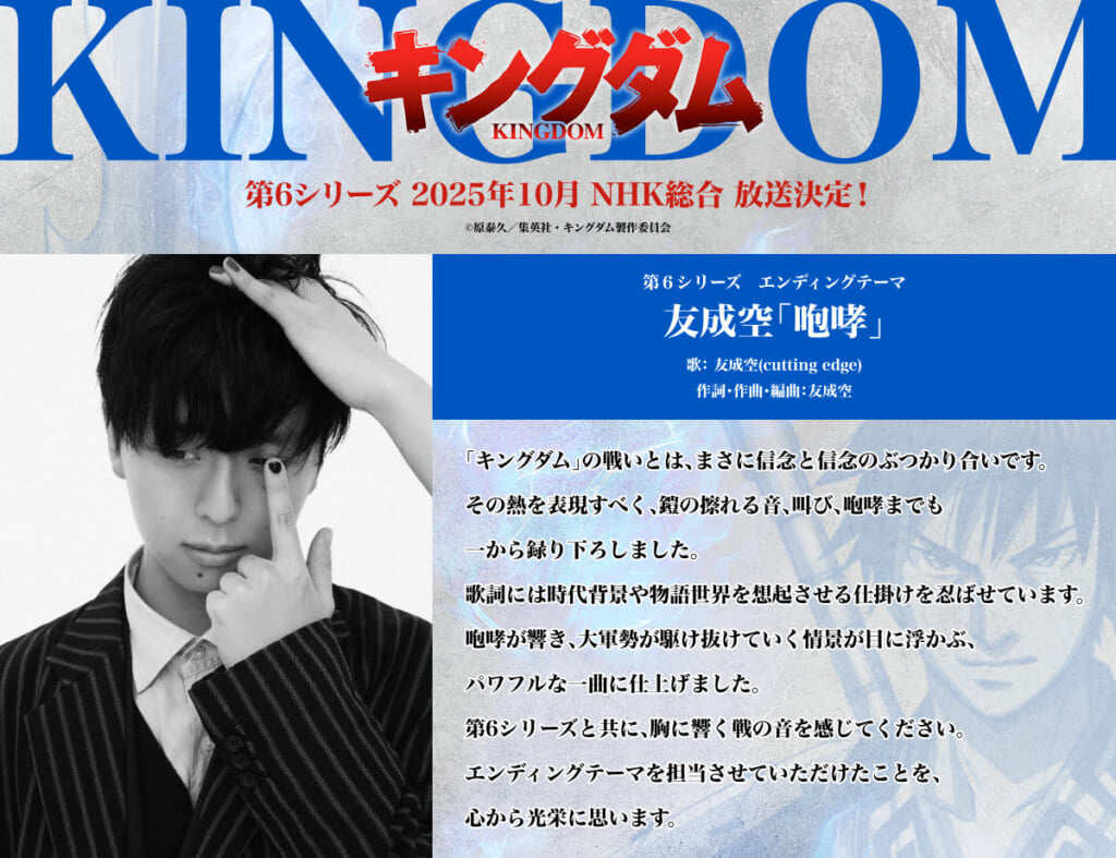 友成空の新曲「咆哮」が、NHK総合にて放送予定のTVアニメ『キングダム』第6シリーズエンディングテーマに決定した。