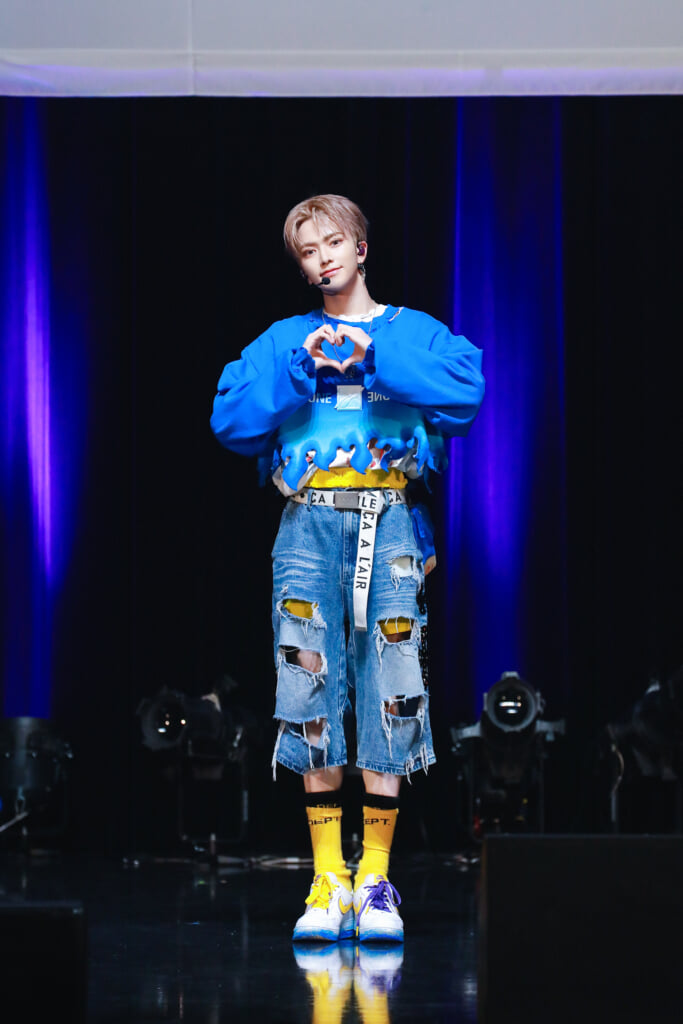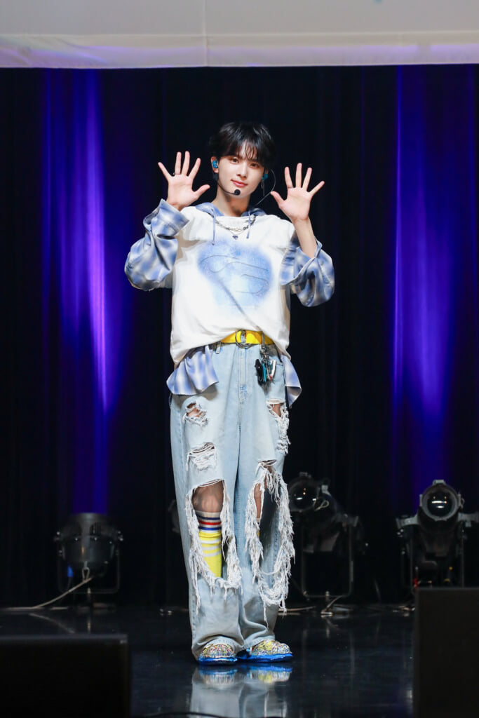 今回のシングル収録曲の中のポイントダンスについては、タイトル曲「青い太陽 (The Blue Sun)」のサビ部分にあたるキャッチーな”バーニングアップダンス”を雅久 (GAKU)がレクチャーし、メンバーみんなで披露する場面も。また、メディアからの質疑応答では、ヨーヨーパフォーマンスを披露してほしいというリクエストに琉楓(RUKA)が難易度の高い技を披露すると、会場からは歓声どよめきがあがった。