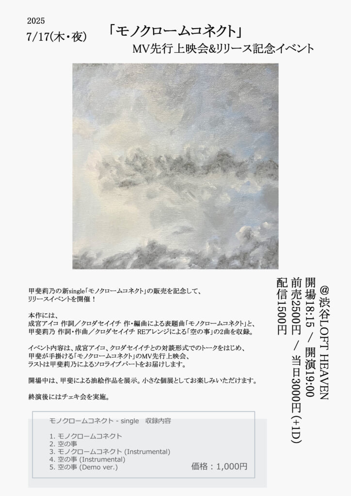 なお、フィジカル盤には、表題曲「モノクロームコネクト」のほか、甲斐莉乃自身が作詞・作曲を手がけた「空の事」、「モノクロームコネクト」のインストゥルメンタルやデモバージョンなどを含む全5トラックが収録されている。こちらは7月17日に渋谷LOFT HEAVENにて開催されるリリース記念イベントより販売が開始される。
