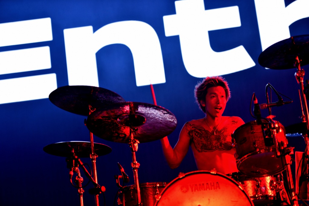 ENTHお馴染みの、酒便を片手に持っての登壇。バニーボーイを交えてのだいぽん(ダト・ダト・カイキ・カイキ)とナオキによる乾杯、延々♪ENTH、ボンバイエ♪がリフレインするSE。朝でもお構いなくパーティーをおっぱじめる3人だが、「おはようございまーす。(見渡して)すげぇなあ。……やりますか!」のひと言でドーンと音が鳴った瞬間から、享楽的なパーティーとはまったく違う、あらゆるバウンダリーを突破するための狂宴の開始である。