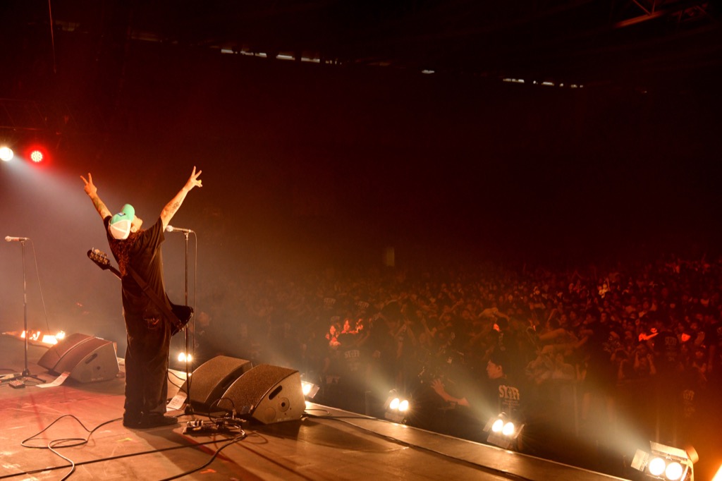 これは、ライヴ後半にだいぽんが言い放った言葉である。好きなものを好きと言って、大切な人をぎゅっと抱き締めて、その本当の心だけを人生と呼ぶ。そんな彼らのスタンスが端的に表れた名MCだと思うし、何より、その言葉の端々に滲む切実さは音に宿ってとんでもない熱の渦を生み出している。「SCUM DOGS FART」ではギュイギュイと鳴るリフがリズムとして機能して、ヘヴィなビートが腹を殴って、腹にクる音に乗ってピットが揺れる揺れる。