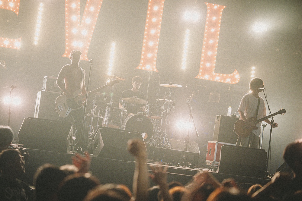 ツインボーカルとエネルギッシュなバンドアンサンブルで力強く攻めていく「証」、アクセルを踏み込むようにスピードを上げていくメロディックな「ALL SATR」と、前半から前のめりに食らいついていく観客を振り落とさんばかりのボルテージの高いアンサンブルを聴かせる3人。さらに容赦なく、「とことんやろうぜ、サタニック」「もっとこい、もっとこい」という三木の言葉で「GO」と「SILVER」を連投。真っ直ぐに放たれる三木のボーカル、そこに柴田のユニゾンで加速度を増した歌が、会場を勢いよく貫いていくのが気持ちいい。自然と、観客のシンガロングも大きくなっていく。