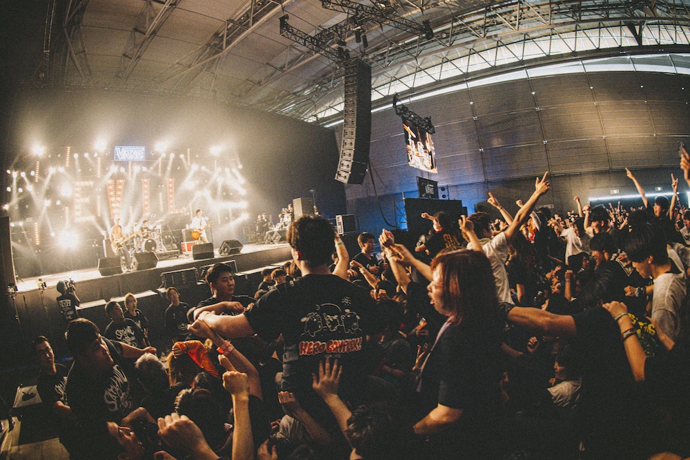 「HERO COMPLEXです、よろしく。来てくれてありがとう。このステージに出るのが夢でした。<SATANIC CARNIVAL>ありがとうございます。PIZZA OF DEATHと<SATANIC CARNIVAL>にリスペクトを込めて、ぶちかまして帰ります!」と、三木は気概たっぷりに語ってギターを奏でながら「巡る」を歌いはじめる。〈二十代はすぐに終わるらしい 無駄なことなどないと今日も言い聞かせる〉――と、このステージに立つ今という時を刻むように歌うと、観客に「まとめてかかってこい!」と一声かけ怒涛のアンサンブルへと突入した。観客のシンガロングも加わった曲は、ドラマ性を何重にも増しながら輝いていく。