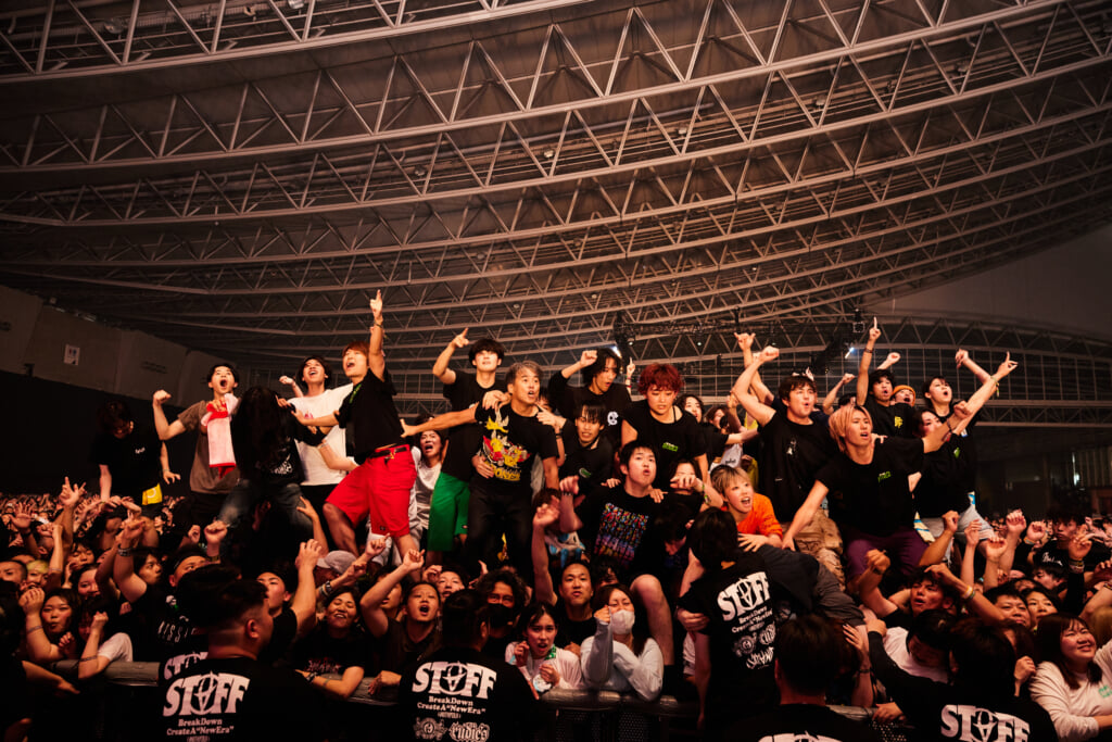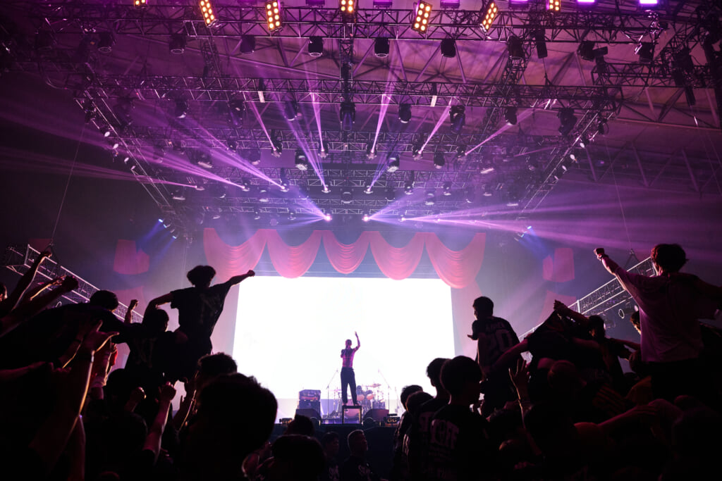 サウンドチェックの後もバンドは板付きのまま、ZAX(Dr)の元にJESSE(Vo, G)、KOKI(G)、T$UYO$HI(B)が集まって気合を入れると、ステージ背面のビジョンに鮮烈な“WE ARE THE BONEZ”のアートワークが映し出された。歓声や拍手が沸き起こるなか、T$UYO$HIがフロントでパワフルにベースを奏で「We are The BONEZ」へと突入した。強靭でいてしなやかなアンサンブルに、早くも観客が飛び跳ねて、シンガロングを大きくしていく。その一体感たるや凄まじい。JESSEはステージを跳ね回りながら、「聞こえねえな」「もっともっと」と煽り、観客の声を大きくしていきながら続く「Love song」へ。ド派手でエネルギーに満ち満ちたアンサンブルとキャッチーで陽性なメロディに、会場内が明るさを増して、めちゃくちゃ元気な観客たちがステージ前方をもみくちゃにしていく。