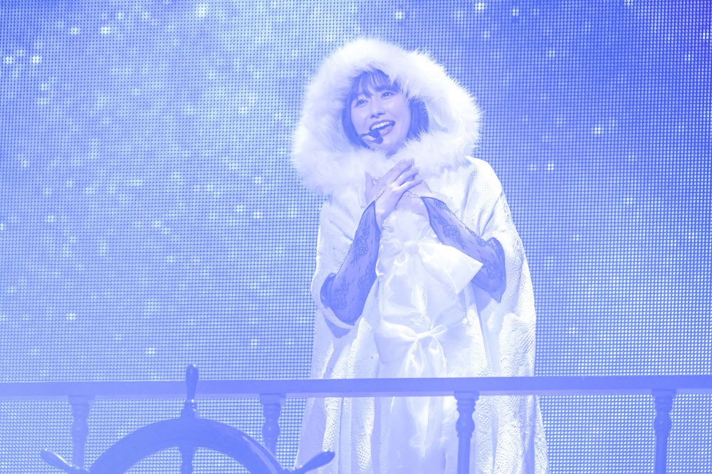 続いての寄港地は北極。モコモコの真っ白なフードを被り、マントのような衣装を羽織った佐々木がステージの高台に登場すると、「ジョイフルワンダーランド」で次のブロックがスタート。オーロラを映し出したような神秘的なステージでのパフォーマンスにプニノフがじっと聴き入っていると、続いては「Grenade」を披露。2015年リリースのナンバーだ。一面が雪と氷に埋め尽くされた美しく真っ白な世界、極限の静寂、そんな北極の景色を表現したステージ上で佐々木が歌唱する姿は、雪の妖精のようにも見えたのではないだろうか。そして、作詞家・岩里祐穂による《もしあの日君に会わなければ 君にもしも会えなかったら こんな こんな 青空も 知らずにいたよ きっと》という歌詞に、10年分のソロコンの思い出や佐々木を推してきた年月を重ねて、目頭を熱くしたプニノフも多かったことだろう。