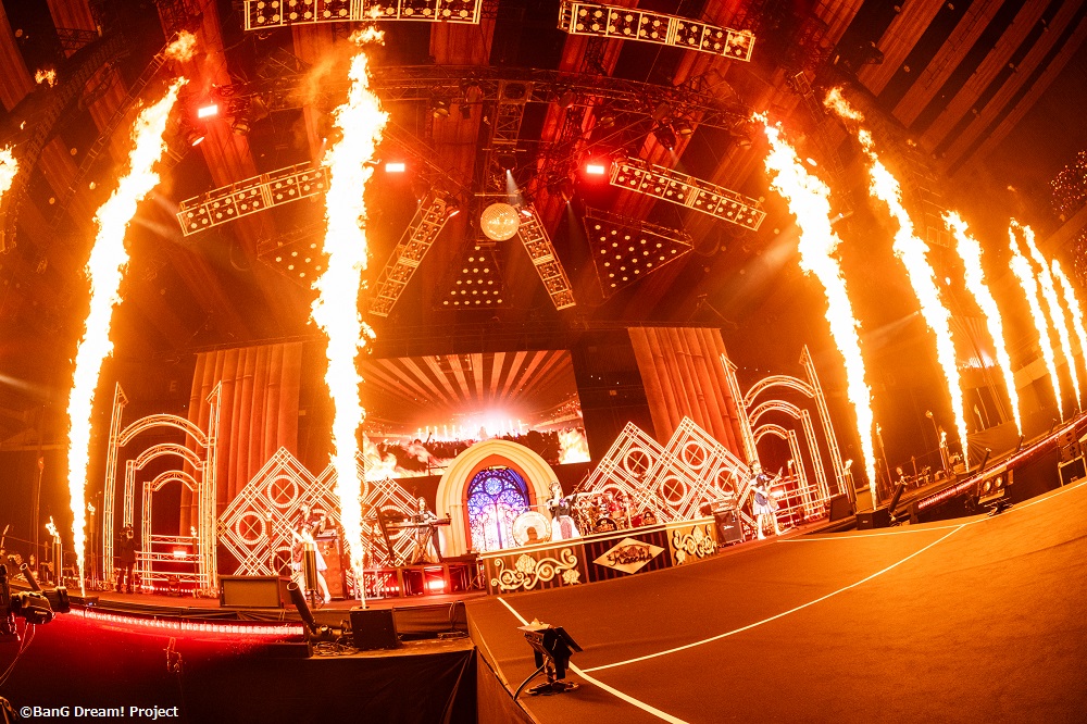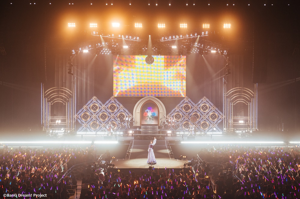 続いて登場したRoseliaは、「未来へ進む勇敢さ」をテーマにした楽曲「overtuRe」でライブの幕を開けた。今年初の国内単独公演となったこの日のステージでは、新旧の人気楽曲を織り交ぜたセットリストを展開。中盤では、6月26日にリリースされる17thシングルの表題曲「Requiem for Fate」と、カップリング曲「Keep Heart」をライブで初披露。花道からセンターステージへと移動しながらのパフォーマンスでは、会場全体を包み込むような演出が観客を魅了した。