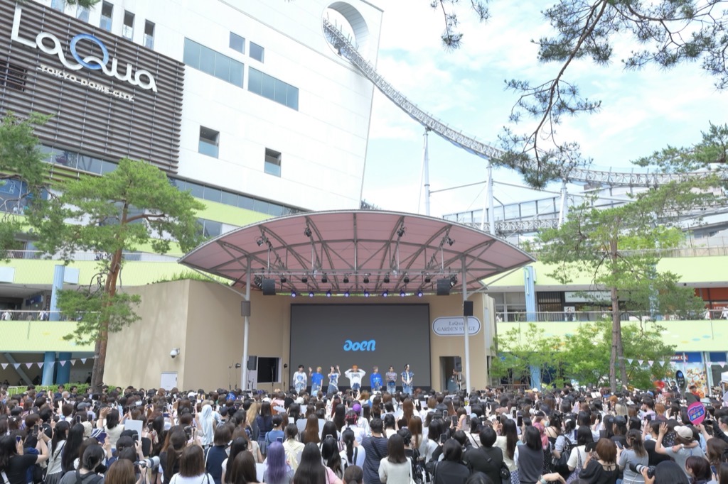 これまでメンバーそれぞれの出身地である宮崎、宮城、群馬、長野を巡ったイベントのファイナルとなったラクーアガーデンステージ。この日は真夏日にも関わらず、ラクーアガーデンステージには多くのaoring(aoenのファンネーム)が駆けつけ、ステージ前のみならず2階のスペースまでびっしりとネームボードを持ったaoringたちで埋め尽くされた。