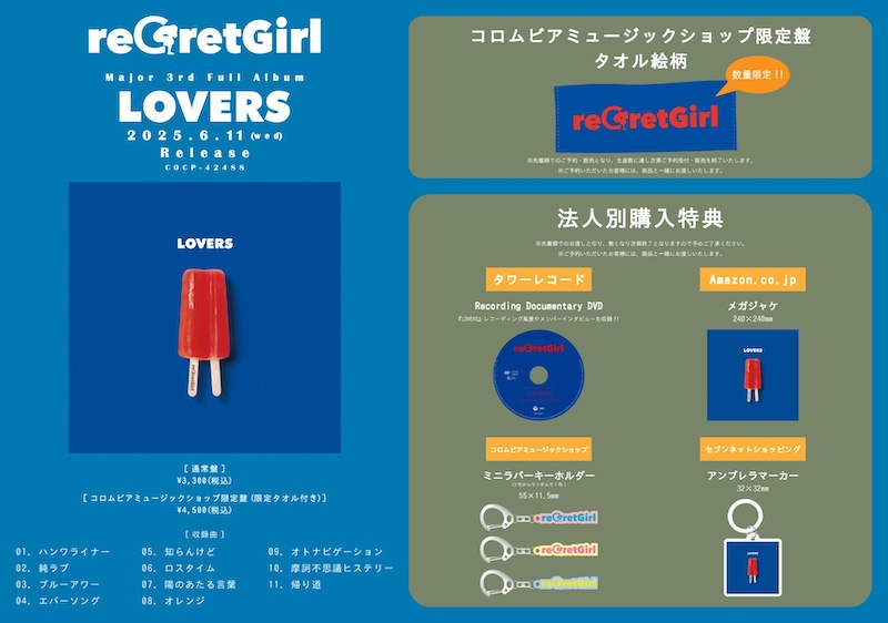 reGretGirlは今年で結成10周年を迎え、6月11日には約2年ぶりとなるメジャー3rdフルアルバム『LOVERS』をリリースした。6月19日からは初の東名阪ホール公演を含む自身最大規模のワンマンツアー<reGretGirl presents ONEMAN TOUR 2025”for LOVERS>を、全国25カ所にて開催中。詳しくはreGretGirl公式HPをチェックして欲しい。