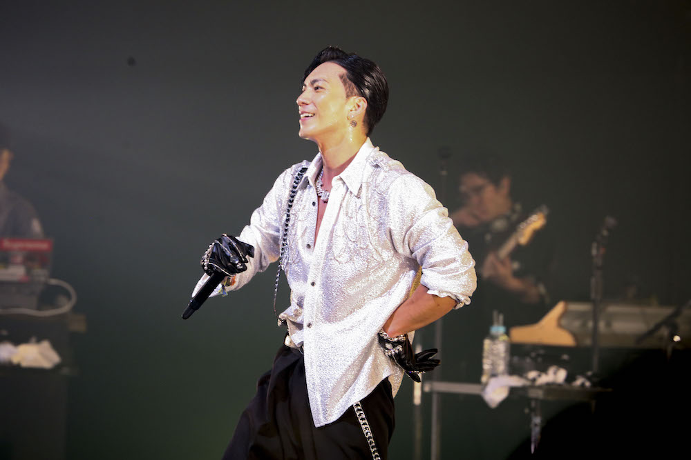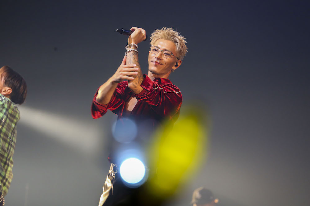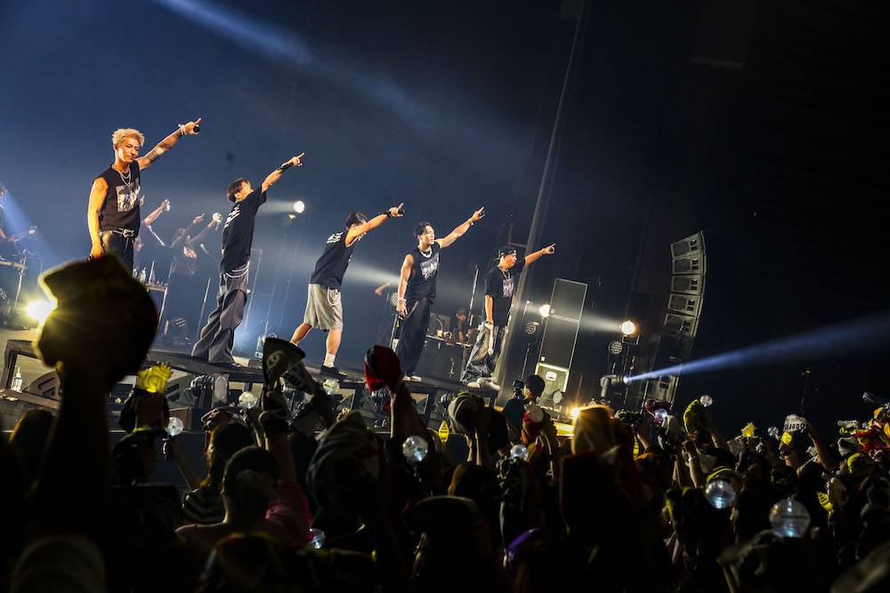 そのまま1曲目は「Scream」。幕の内側からでも5人が既にフルスイングで歌う姿が伝わり、中毒性のあるリリックも相まって会場の一体感が高まっていく。そしてドラムカウントを合図に紗幕が降ろされ、更なる大歓声の中、SWAYが「大阪ファイナル!Are you ready⁉︎」と呼びかけ、5人がお立ち台に立ち「Take A Ticket」をスタート。歌い出すと5人はステージ上を自由に歩きながら曲を展開する。KUBO-C、GS、P-CHO、SWAYのそれぞれの個性の出た4MCのラップパートとKAZUKIのクールでカリスマ性のあるボーカルのバランスが、唯一無二の上質なグルーヴを生み出す。そしてP-CHOを中心とした煽りが、ライブならではのメリハリを生んで熱気が上がり、楽しくなるほかない。