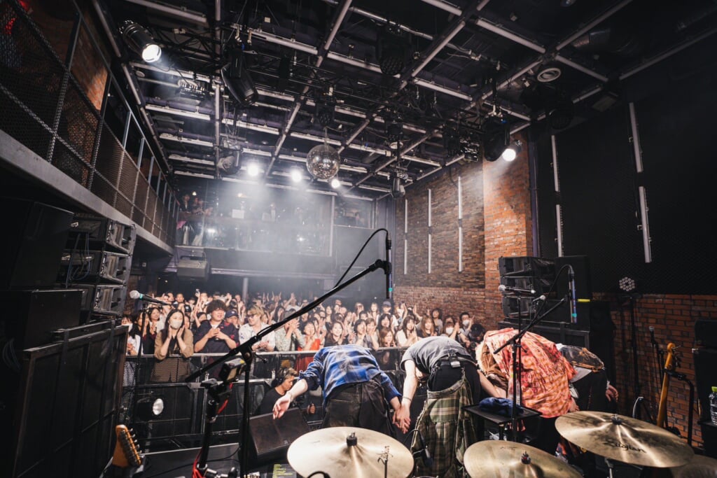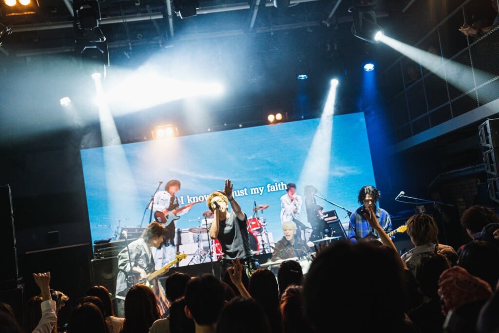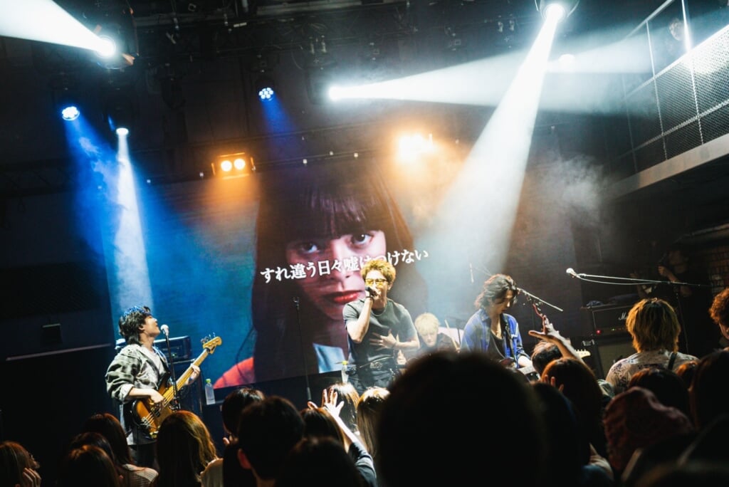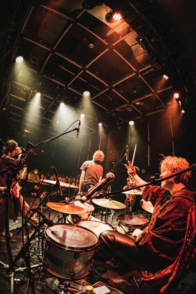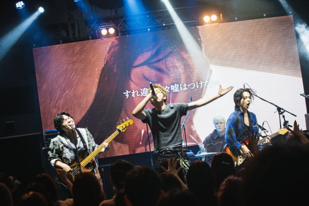 「先週、TikTokにアップした動画の再生回数が60万回を超えました。その曲をやります」という曲紹介に客席から悲鳴に近い歓声が沸いたカバーの2曲目は、優里の「恋人じゃなくなった日」。同期でピアノを鳴らし、オリジナルのニュアンスを生かしながら、ロックバラードにアレンジ。hirotoのギターソロを含め、ダイナミックな演奏をストレートに観客にぶつけたところに曲の魅力だけに頼らない、ロックバンドらしい矜持を感じたのだが、その言葉はテレビアニメ『転生宗主の覇道譚 〜すべてを呑み込むサカナと這い上がる〜』のオープニングテーマに決定したことを発表して、観客を喜ばせてから演奏した「鬼灯」にこそ使うべきだろう。ギターソロでエンディングと思わせながら、バンドの演奏はまるでブレーキが焼き切れてしまったようにタイトルコールから再びサビになだれこむと、ファンキーなグルーブをうねらせ、さらに白熱していく。