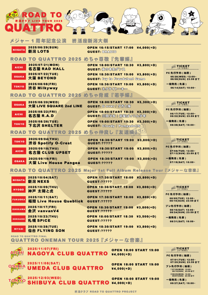 10月には<Major 1st Full Album Release Tour 2025『メジャーな音楽』>の開催も決定しており、6会場をめぐるツアーに続き、11月からは東名阪QUATTROワンマンツアーが開催される。7月から9月にかけては「ROAD TO QUATTRO 2025」と題したシリーズイベントが開催される。各月異なるテーマでのライブが予定されており、「めちゃ尊敬『先輩編』」「めちゃ脅威『若手編』」「めちゃ仲良し『友達編』」といったユニークなサブタイトルが付けられている。