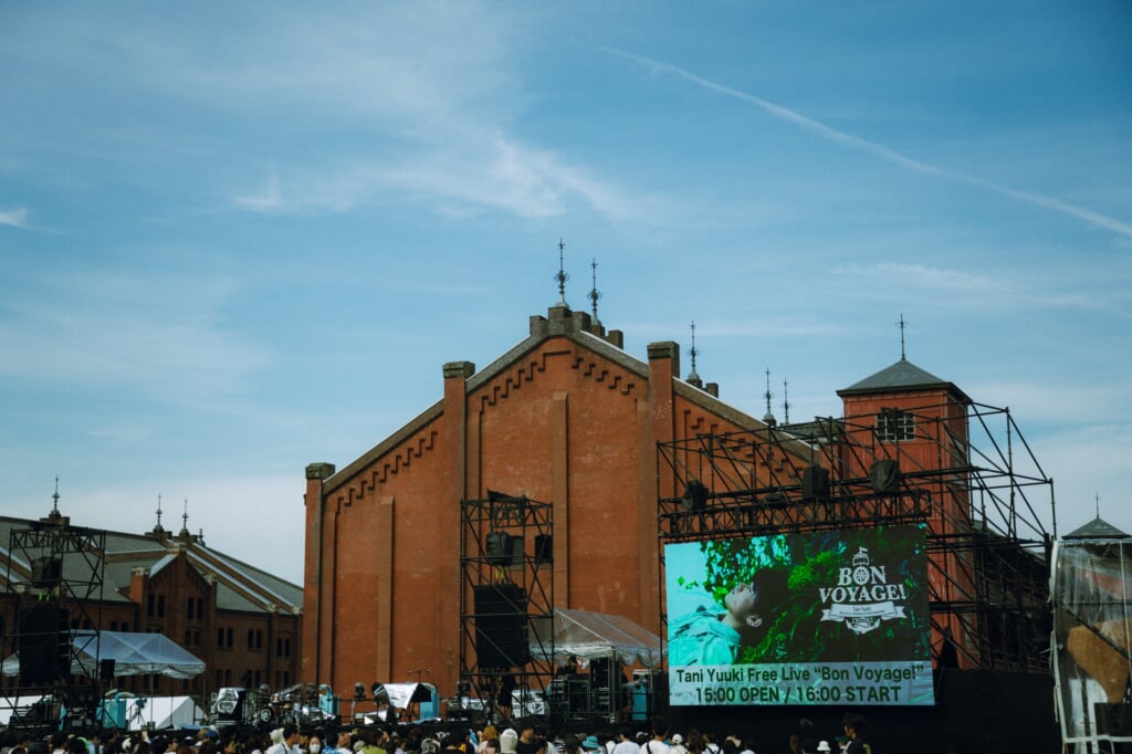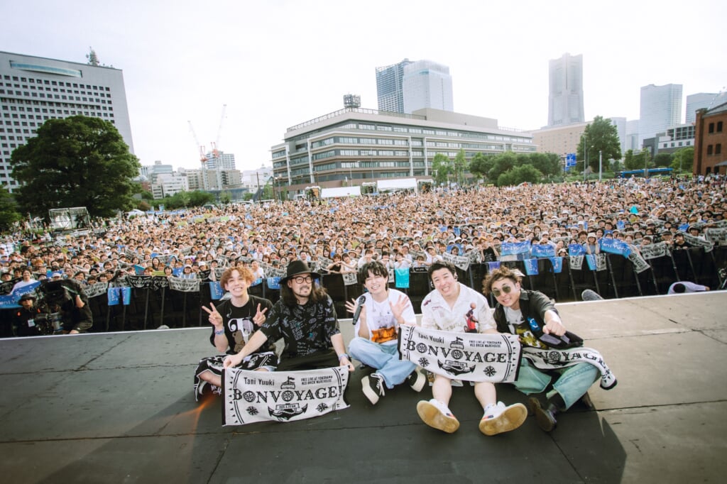 <Tani Yuuki Free Live “Bon Voyage!” at 横浜⾚レンガ倉庫>では、人気曲を惜しみなく入れたセットリストで、ニューアルバム『航海士』収録曲含む全11曲を計5,000人の前で演奏した。オリジナルコラボドリンク/フードの販売や、Tani Yuukiの地元・茅ヶ崎の人気からあげ店の出店などもあり、赤レンガ倉庫はお祭り状態に。ちなみにTani Yuukiは、フードとドリンクを全制覇したいという想いで、この日のために体脂肪を落としてきたそうだ。