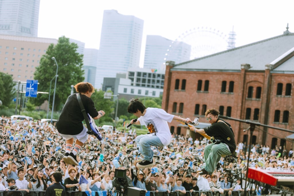 そのあとは、ギターを持ち始めてからの10年、デビューからの5年を振り返って、「別れもあったけど、その別れがなかったら、今の仲間、友達には出会えなかったし、この景色には出会えなかった。今日赤レンガであなたと出会えたから、それだけでよかったなって思えるんですよ」と語った。そして「かけがえのない出会いに、この歌を」と言ってから、大ヒットソング「W/X/Y」。歌詞の一部を“晴れならやっぱ赤レンガに出かけよう”と変えて歌うあいだ、オーディエンスはそれぞれの大切な人を思い浮かべながら聴き入っている様子だった。「歌ってくれ、横浜!」とシャウトしてから突入した最後のサビでは、大合唱が起きた。