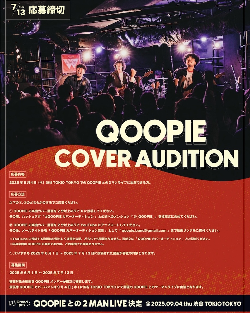 また、最優秀バンドはQOOPIEと対バンできる<QOOPIE COVER AUDIOTION>を開催中。QOOPIEの楽曲のカヴァー動画をXに投稿、もしくはYouTubeにアップしたバンドの中から、最優秀バンドは9月14日に東京・渋谷TOKIO TOKYOにて行われるイベントにてQOOPIEと対バンできる企画だ。応募期間は7月13日までとなっているのでぜひ応募してほしい。