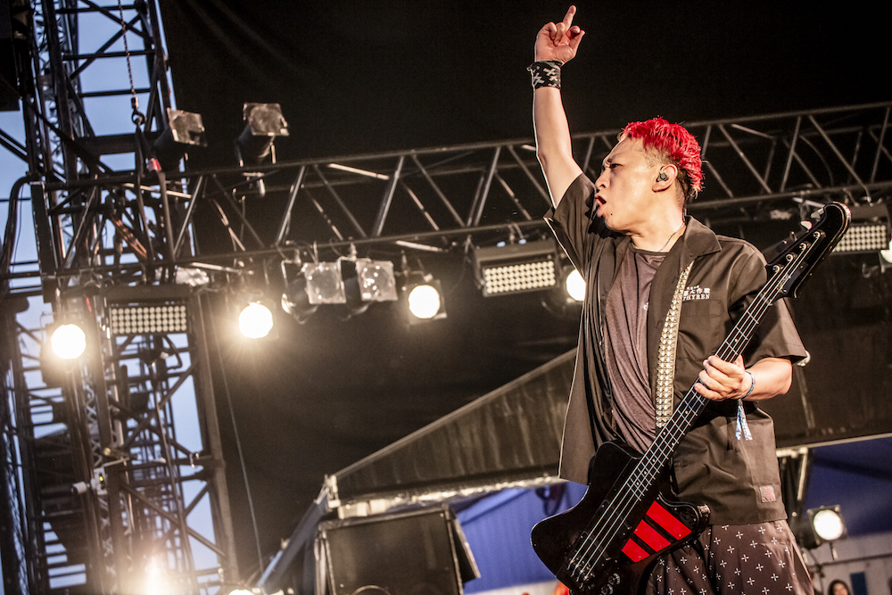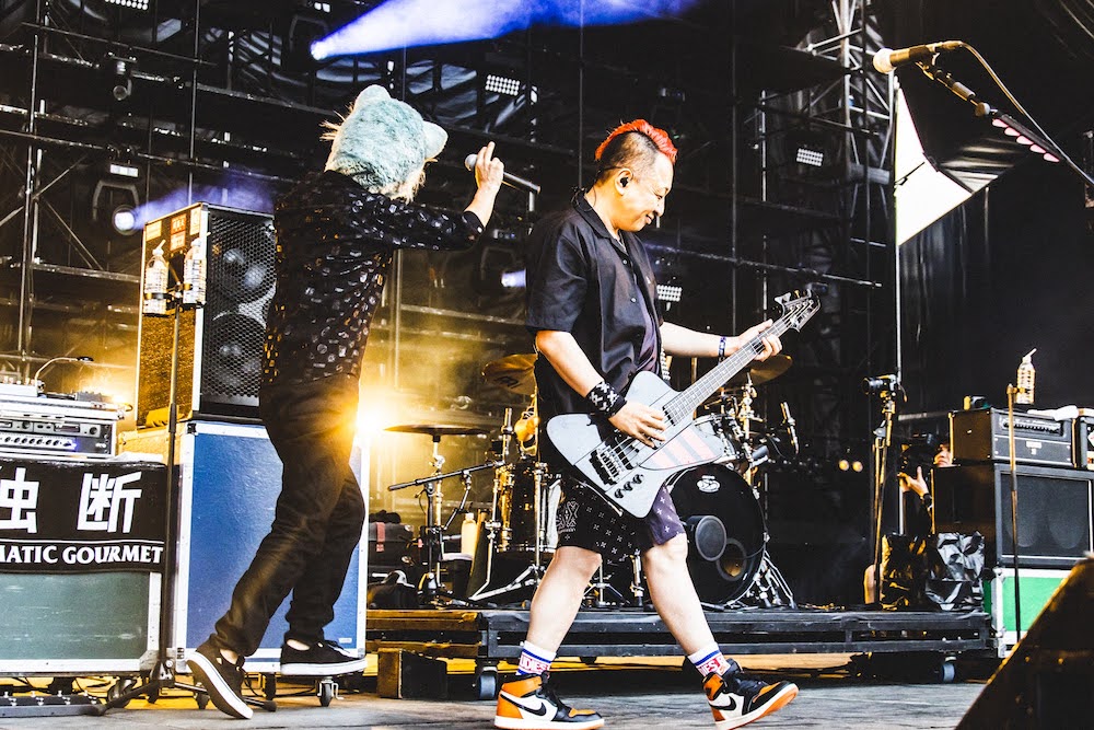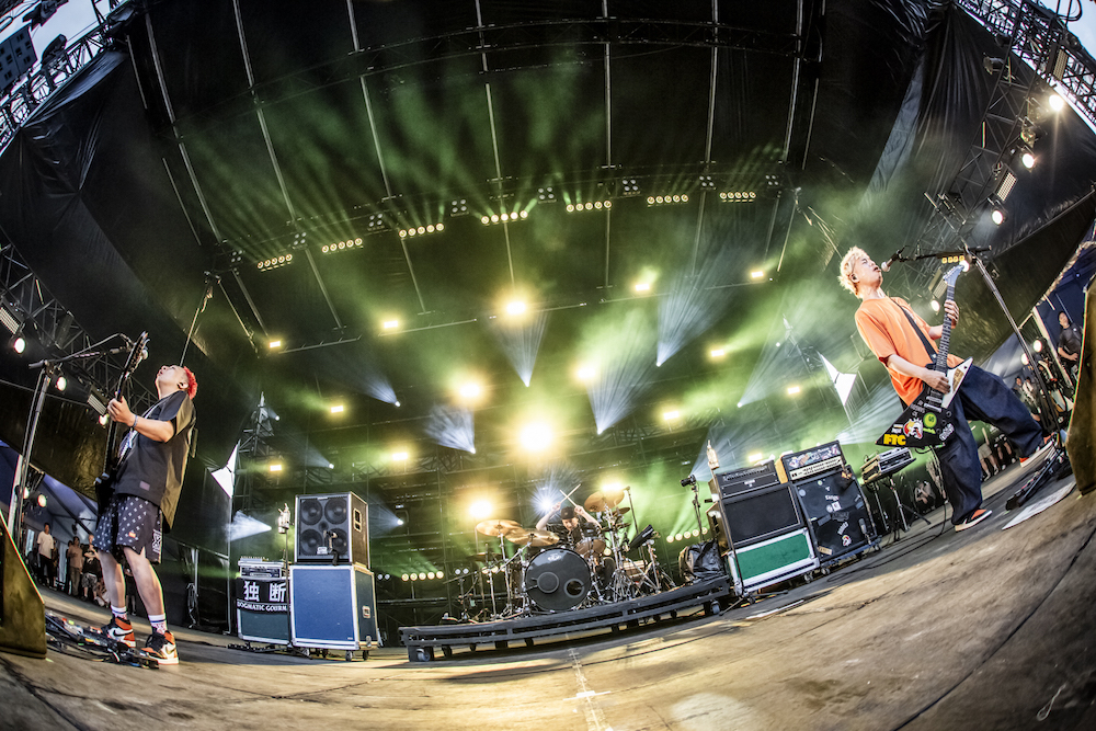 KOUICHI(Dr)、NAOKI(B)が登場し、TAKUMA(Vo, G)の「おーい、すっとぼけにきたぞ。やれるか、お前ら」という言葉と共にライブは「JUNGLES」でスタート。ギターリフとビートから、ブリブリに低音のベースが観客の興奮を駆け上がらせていく。ダイナミックなビートにコブシやシンガロングが上がり、グラウンド一面が観客のジャンプで波のように揺れる。頭からパワフルだ。続く「super stomper」は、先ほどのMAN WITH A MISSIONのステージでのお返しとでもいうように、Tokyo TanakaとJean-Ken Johnnyが登場。オオカミふたりがステージを無尽に駆け巡って、アジテートする。