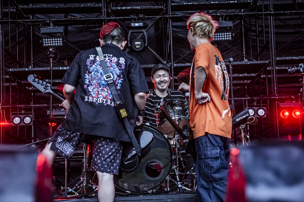 終演後、MCを務めたMobstyle田原氏と共にあいさつに立った3人。NAOKIは「今日はありがとうございました。体調とか大丈夫ですか、僕はもう限界です」と言いつつ、「朝ここに向かう前にドラッグストアに寄った時、京都大作戦のTシャツを着ていたら、店員さんに“私はいけないので私の分まで楽しんでください!”と言われたので、店員さんの分まで楽しみました! もう今日は大満足なので、みんな家に帰るまで体調崩さず、明日来る人は体調万全で遊びに来てください」と語る。