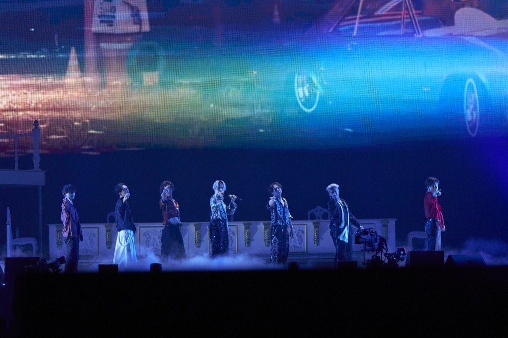 間も無くファンファーレのようなイントロが鳴り出し、今市が「Welcome to KINGDOM!Are you Ready?ここにいる全員手を掲げろ!」と告げて、「RAISE THE FLAG」を始める。7人のパフォーマンスだけでなく、50名を超えるサポートダンサーによるフラッグを使ったパフォーマンスも、今日この王国に入国したMATE1人ひとりを歓迎するかのように盛り上げる。曲中には7人が会場中央のサブステージに移動し、臨場感たっぷりに歌声とダンスを届ける。ただØMIの「ファイナル準備はいいか!」から始まった「O.R.I.O.N.」の途中からフロートステージにメンバーが移動。これは要するに動くステージで、アリーナを縦横無尽に動き、よりMATEに接近していく。ただでさえジャンプ不可避のノれる代表曲なのに、そんなことされちゃ自己最高跳躍をせずにはいられない全方位のMATE。NAOTOが促していたクラップの音も〈YEAH!YEAH!YEAH!〉のシンガロングも大きくなる。そんな数万人の一体感から生まれた幸せな空気感を受け取って始まった「Yes we are」の時に映し出されたメンバーの顔は一様にほころんでいるように見えた。