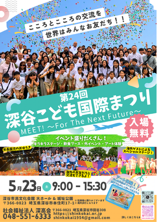 社会福祉法人深高会が主催する今年で24回目を迎える恒例イベント『第24回深谷こども国際まつり MEET! ~For the Next Future~』が、2026年5月23日土曜日に深谷市民文化会館大ホールおよび深谷城址公園で開催されます。このイベントは、先代の故後藤高明統括園長が高校時代の留学経験に基づき、「言葉が通じなくても気持ちは通じ合える」という理念のもと、世界各国から子どもたちを招いて始まりました。現在は、亡き父の跡を継ぎ、自らも留学経験を持つ後藤慈明統括副園長が中心となって実施しています。(写真は過去の様子)