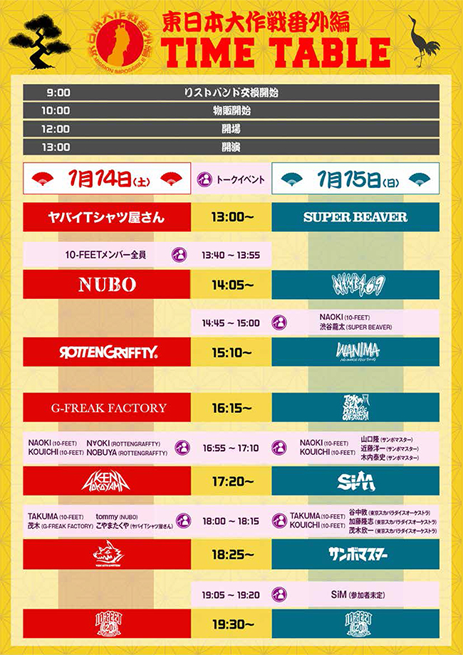 10-FEET主催<東日本大作戦番外編>が1月14日および15日の2日間、ゼビオアリーナ仙台にて開催される。10-FEETは、2011年3月11日の東日本大震災以降、被災地に支援物資を届ける“ふとん大作戦”や被災地域をツアーで廻る“東日本大作戦”をはじめとする復興支援活動を継続的に行なってきた。大都市・仙台の屋内アリーナで行われる<東日本大作戦番外編>には、その意志に賛同する全13バンドが集結。BARKSは2日間の模様を速報レポートで随時公開していく。