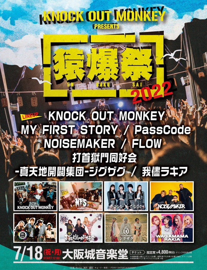 KNOCK OUT MONKEY主催イベント<猿爆祭2022>が7月18日、大阪城音楽堂で開催される。2004年にスタートした同イベントが舞台を大阪城音楽堂に移し、3年ぶり復活。全8アーティストの熱演を現地からリアルタイムレポートでお届けしたい。