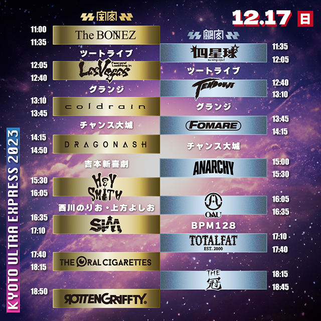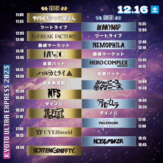 ROTTENGRAFFTY主催による京都の冬フェス<響都超特急2023 ~KYOTO ULTRA EXPRESS~>が12月16日および17日の二日間にわたって、京都パルスプラザで開催される。金閣と銀閣の2ステージ制で行われる同フェスは2日間計30アクトに加え、幕間に計10組の芸人も出演するなど、ROTTENGRAFFTYならではの賑わい。金閣のリアルタイムレポート、銀閣のフォトギャラリーから、2日間の熱気をお届けしたい。