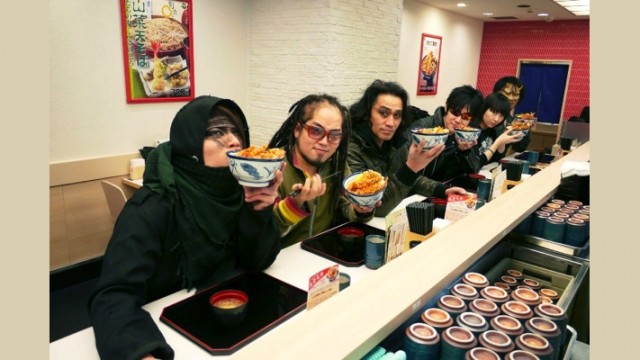 天丼チェーン『てんや』公認エビメタ・バンド、『てんや』店内ライヴ成功を祝して天丼で乾杯