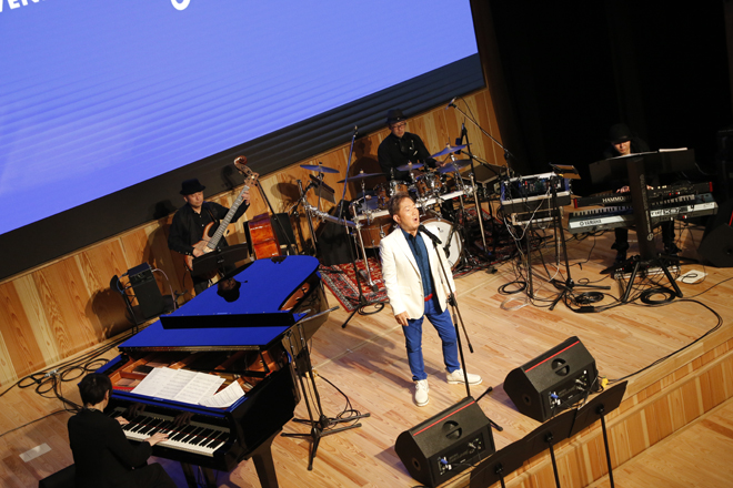 せり上がったステージ上には、小泉たかし(Pf)、平石カツミ(B)、足立浩(Dr)、滝野郁瑛(Syn)というバンドがスタンバイ。姿が見えないケン・カタヤマのメッセージからステージが始まった。1曲目は「新型コロナウィルス、そして最近の意大雨災害で亡くなられた多くの方々に追悼の意を込めて」の「アベ・マリア」。美しいピアノの伴奏をはじめ、バンドの演奏をバックにケン・カタヤマの心を揺さぶる歌声を堪能できる一曲だ。続く2曲目目はアイルランド/ノルウェーのミュージシャン、シークレット・ガーデンの楽曲「ユー・レイズ・ミー・アップ」。こちらはケン・カタヤマ自身が日本語詞をつけたもの4披露された。