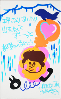 彼のパフォーマンスは、絵を描きながら自作曲を歌うこと。日々の生活で感じたことを絵と曲で同時に表現する。身近なことがテーマで、時には重々しく、時にはポップ。どんな制作をしているのかは、PV映像を見ていただきたい。また楽曲の方もポップで、80年代のジャパニーズ・ポップスの正統な作りを継承している。