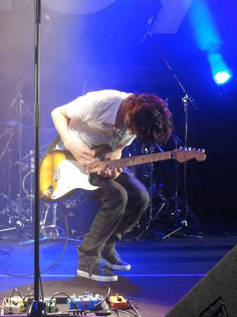 1曲目「Hello, Buddy」。叩くようなギターリフとアグレッシブなチョッパーベースで、歯切れ良く重心の低いファンクロック・ナンバーを放った。ルーストリッパーのギターとサポートギター、ベース、ドラムのピタリと合った演奏、音圧が、じわじわと人を集めはじめる。