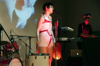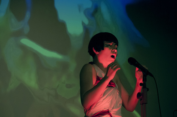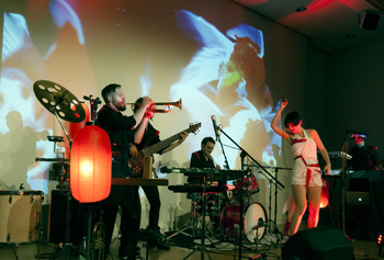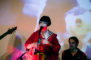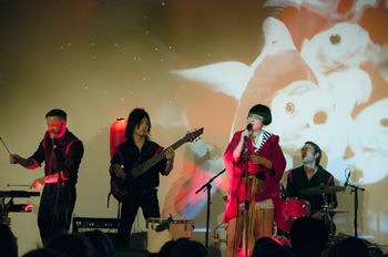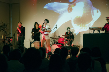 戦前のスタンダード・ジャズから1970年代のグラム・ロック、そして現代の日本の歌謡曲/ポップまでを一気に串刺しにしたような音楽性。スリリングな短編小説を読んでいるかのように、ドラマチックな構成美を持った楽曲。そして、ヴァイオリニストであり、作曲家でもある女性ヴォーカリスト Yuka Otsuki の赤と白を基調としたコスチュームが、ステージの背景に映し出された金魚の映像と絶妙にマッチしている。