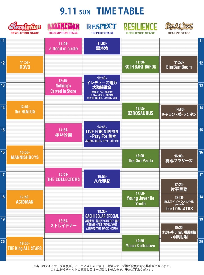 ACIDMAN、a flood of circle、赤い公園、THE COLLECTORS、ダイノジ(Talk&Live)、the HIATUS、インディーズ電力 大取締役会、Nothing’s Carved In Stone、THE King ALL STARS(加山雄三、佐藤タイジ、古市コータロー、名越由貴夫、ウエノコウジ、武藤昭平、山本健太)、八代亜紀、さかいゆう feat. 福原美穂 、the LOW-ATUS、ROVO、浜崎貴司 GACHI SOLAR SPECIAL(浜崎貴司、仲井戸“CHABO”麗市、佐藤竹善(Sing Like Talking)、PES(RIP SLYME)、山田将司(THE BACK HORN))、MANNISH BOYS、LIVE FOR NIPPON 〜Pray For 熊本〜 (高田漣.・東田トモヒロ・山口洋)、 片平里菜、黒木渚、真心ブラザーズ、ストレイテナー、チャラン・ポ・ランタン、BimBamBoom、Young Juvenile Youth、OZROSAURUS、ROTH BART BARON、TheSunPaulo、Yasei Collective、iCas(インディーズ電力 大取締役会)