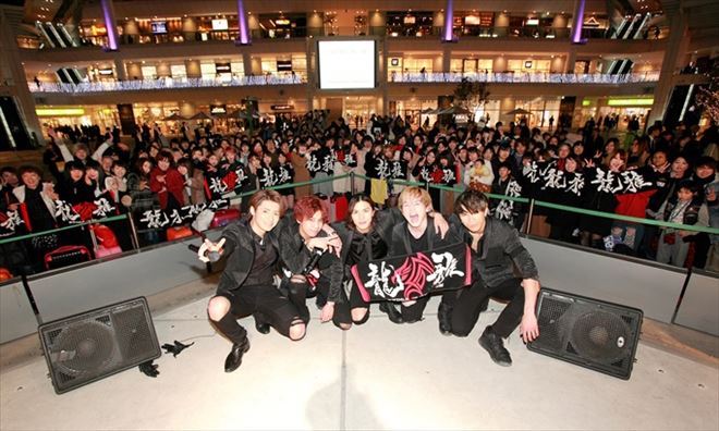 2月の寒空の中、5人は新曲のタイトルのように燃えるような熱いパフォーマンスを披露。イベント最後の曲「Enter The Dragon」では、パフォーマーの後藤慶太郎がおもむろにジャケットを脱ぎ捨てダンスで鍛え上げた上半身をあらわに見せつける場面も。