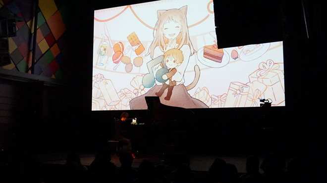 ステージ上部に設置されたスクリーンに映し出されたみっちゃんのイラストに対し「みっちゃん、眠くなったの? 寝ていいよ。どんな夢見るのかな? 皆さんも夢見る準備、OK?」と優しく語り掛けるmiroの声がホールに響くと、本人が静かにグランドピアノの前に登壇。椅子にゆっくりと腰を下ろし、さっそく得意の即興でメロディーを奏で始めると、スポットライトが照らされた。