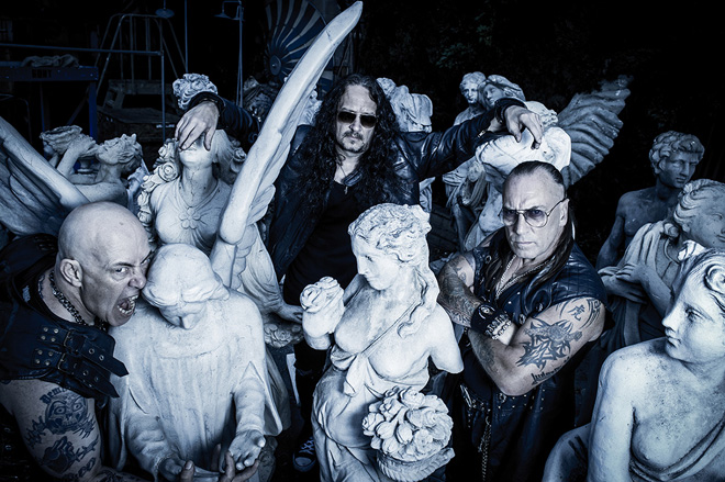トニー・ドーラン:マンタスは曲を書くときに、必ず観客のことを頭に置いているよ。観客が大合唱できるような、例えば「Countess Bathory」みたいな曲。ライブでは、できればアルバムの曲すべてを演奏したい。先日ダンジグとのツアーで「アヴェ・サタナス」を初お披露目したのだけど、早速大合唱になってね。ちょっと変な気分だった。「フォージド・イン・ヘル」が大合唱になるならわかるけど、まさかあの曲がね。次のツアーでは新曲を4~5曲は混ぜたい。どの曲をやるかは日によって変えるようにして。「メタル・ウィ・ブリード」は自分たちとメタル・ファンに捧げる曲だし、ぜひやりたい。大合唱になるだろうし。「ウォー」もやりたいな。俺はいつでもオーディエンスが曲の一部になるようなものをやりたいんだ。合唱したりスラム・ダンスやステージダイブをしたり、とにかくみんなが参加できるもの。自分たちを解放できるだろ。俺たちは日常生活ではいつも妥協を強いられる。でもショーでは思いっきり好きにやれる。とにかく大声で一緒に歌って欲しいね。