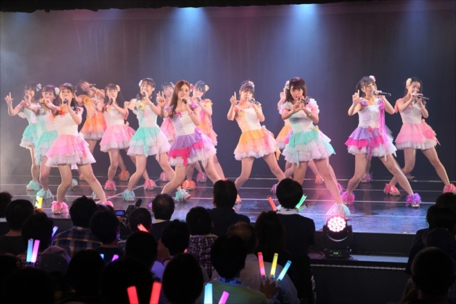 5日の<劇場デビュー9周年特別公演>は「強き者よ」でスタート。「美しい稲妻」「ごめんね、SUMMER」「パレオはエメラルド」「チョコの奴隷」「オキドキ」から最新シングル「意外にマンゴー」まで、これまで9年間に発売したSKE48のシングル曲全21曲を期ごと、チームごと、ランダムメンバーで立て続けに披露。9周年に相応しく1時間に渡るSKE48らしい迫力満点のノンストップパフォーマンスが行われた。
